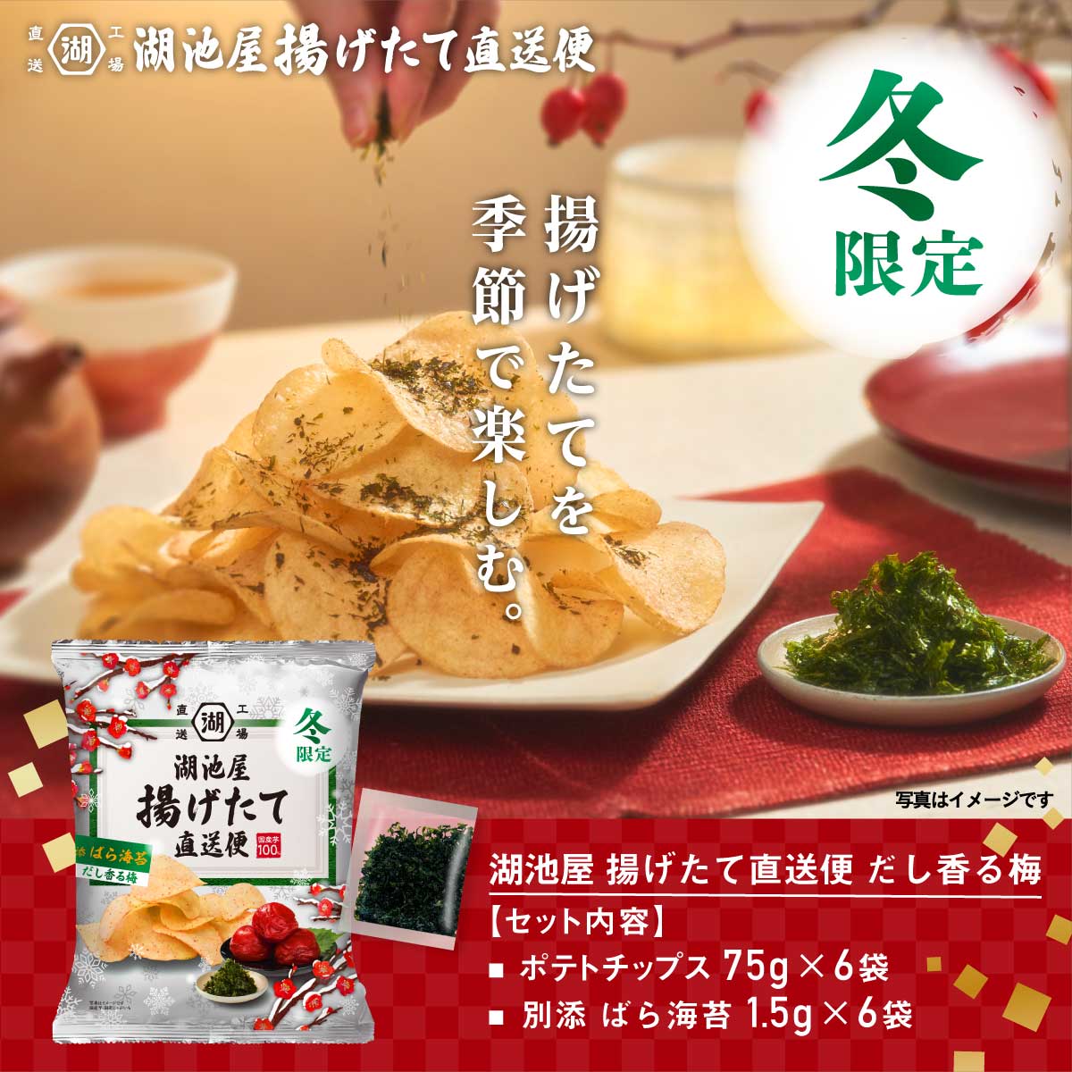湖池屋揚げたて直送便から、冬の季節限定品が登場!年が開けた1月、「だし香る梅」味のポテトチップスに、別添の「ばら海苔」を振りかけてお楽しみください。