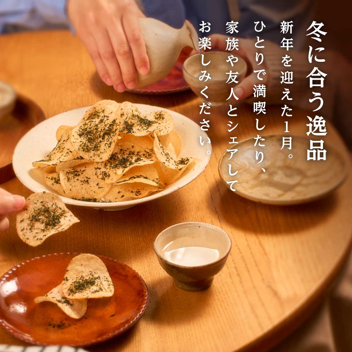 ポテトチップスにとトッピングのばら海苔をのせて、風味を贅沢に楽しむ
