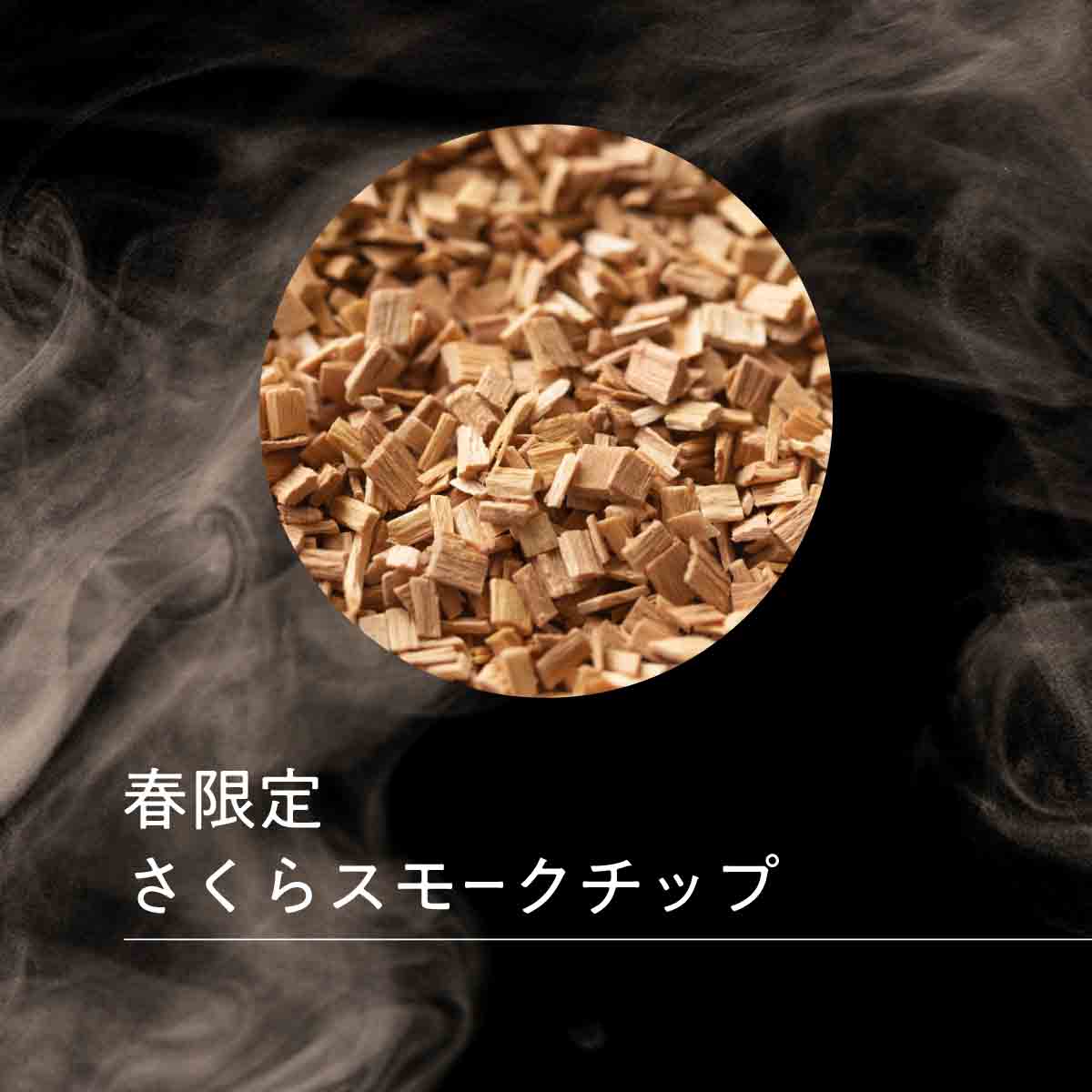 今回は人気の「さくらスモークチップ」を使用。 バランスよく燻製されたチップスは、ほどよく色づき、 袋を開けた瞬間から芳醇な燻製香をまとっています。