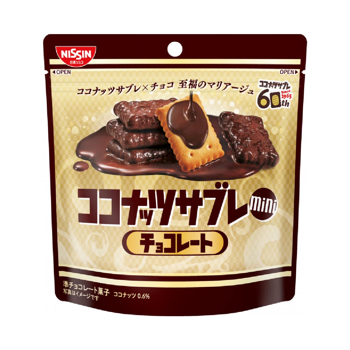 ひとくちサブレとチョコが絡み合うおいしさ!ココアが薫るチョコレートで、サクサクとした食感の「ココナッツサブレミニ」をコーティングしました。
