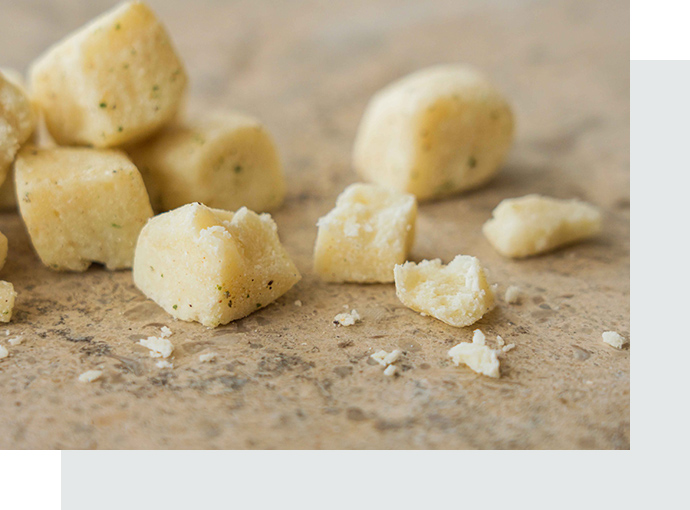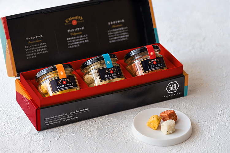 国産じゃがいもを、ひとくちサイズにカット。そこへ、ヴィシソワーズやチリコンカンの味わいをたっぷり染み込ませることで、ぎゅっと味が染み込んだ、クリーミーな一粒に仕上がりました。