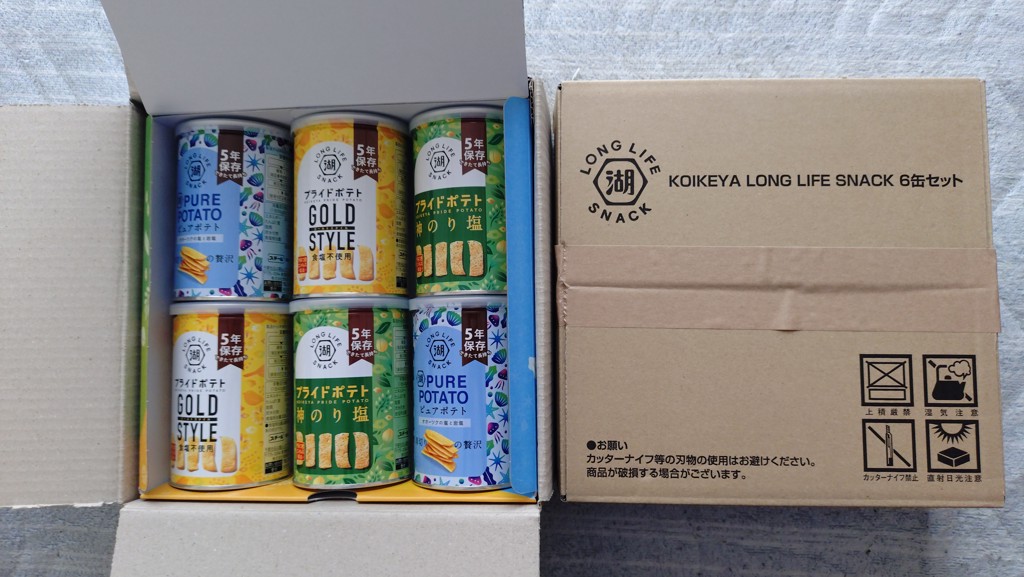 前回湖池屋さんのロングライフ缶を購入しましたが、追加で購入 なんと!一箱買うともう一箱おまけ付きという大盤振る舞い。(^^) なんせ長期保存可能なので正味半額で量はx2!お得なので買いました。 このようなお得情報はメルマガ購読していてお得情報が助かっています。 万が一のため、また(何も無ければ良いに越したことはありませんが) ローリングストックにもってこいの商品でした。